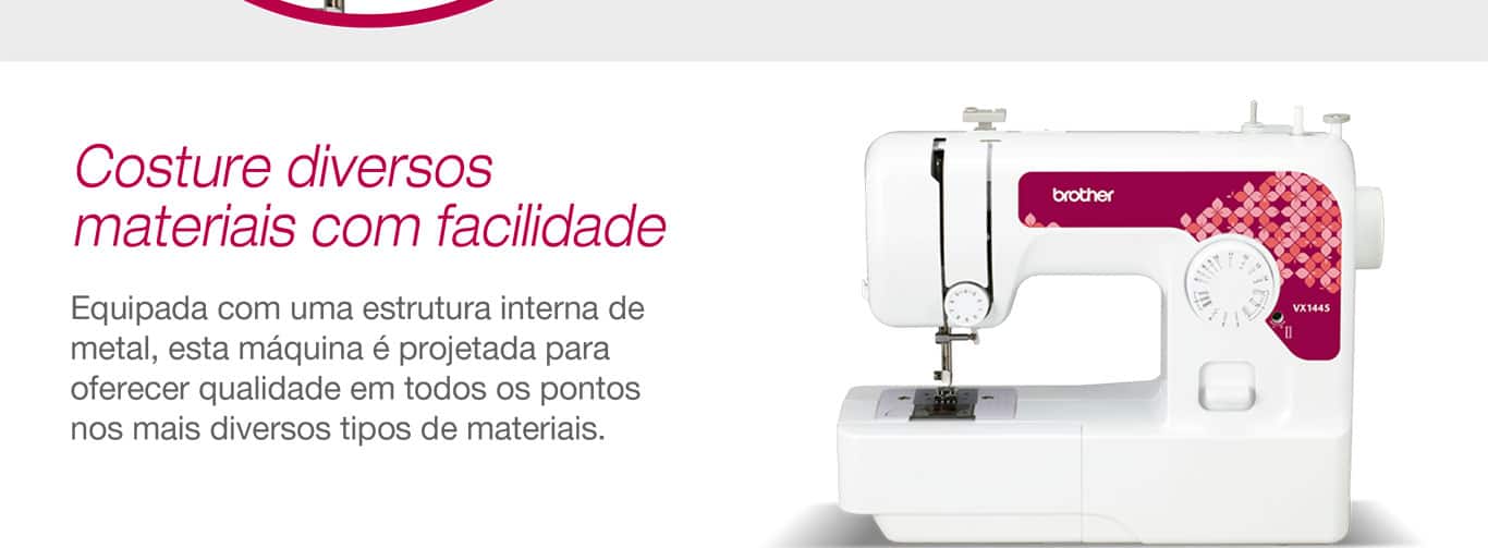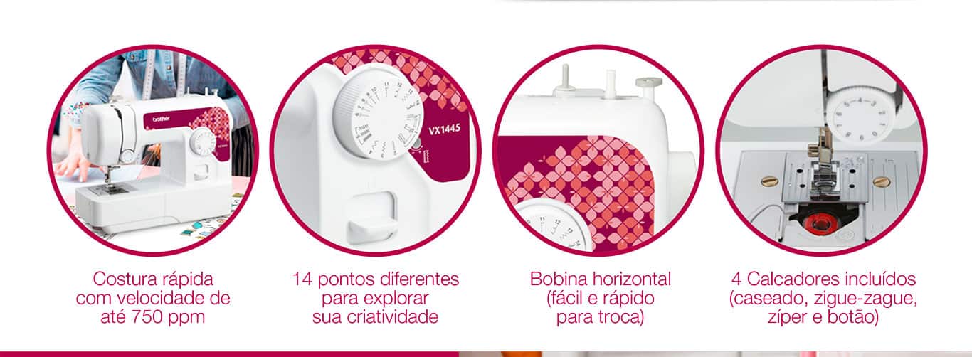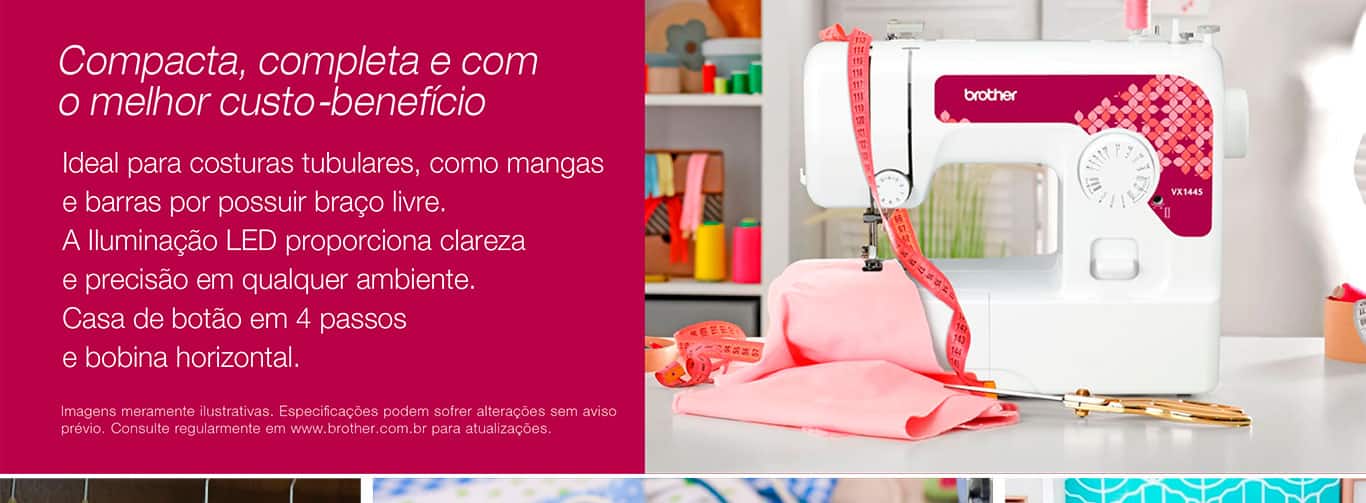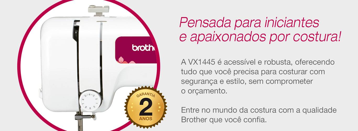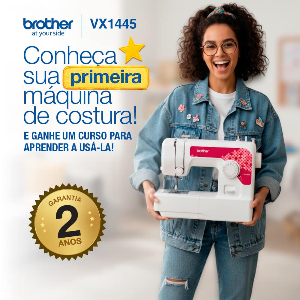 A VX1445 será sua primeira máquina Brother! Compacta e completa para atender todas suas necessidades para criar, consertar e dar asas à sua imaginação. Ela é ideal para que você possa fazer desde aquele pequeno conserto de uma roupa até uma peça que precise costurar camadas. a VX1145 tem 14 pontos, velocidade de 750ppm, já vem com 4 calcadores, iluminação LED e toda a qualidade Brother que você conhece e confia.